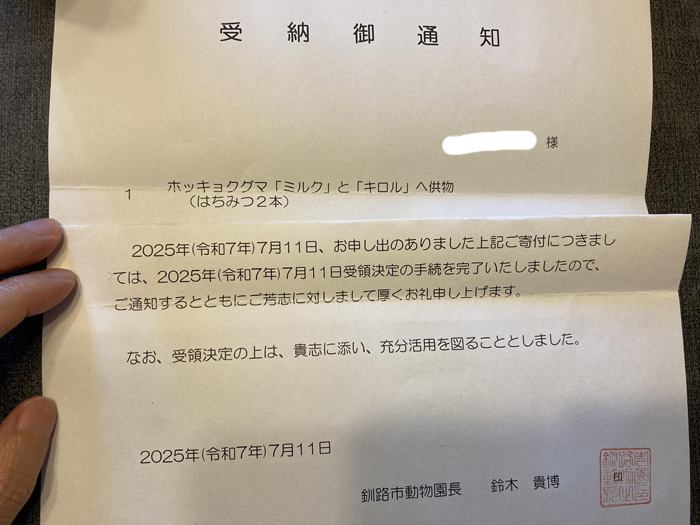 釧路市動物園の動物さんたちに、7月に非加熱の純粋生ハチミツ1kg入りを2本贈りました。(ホッキョクグマのミルクちゃんもキロル君も突然亡くなってしまったため)