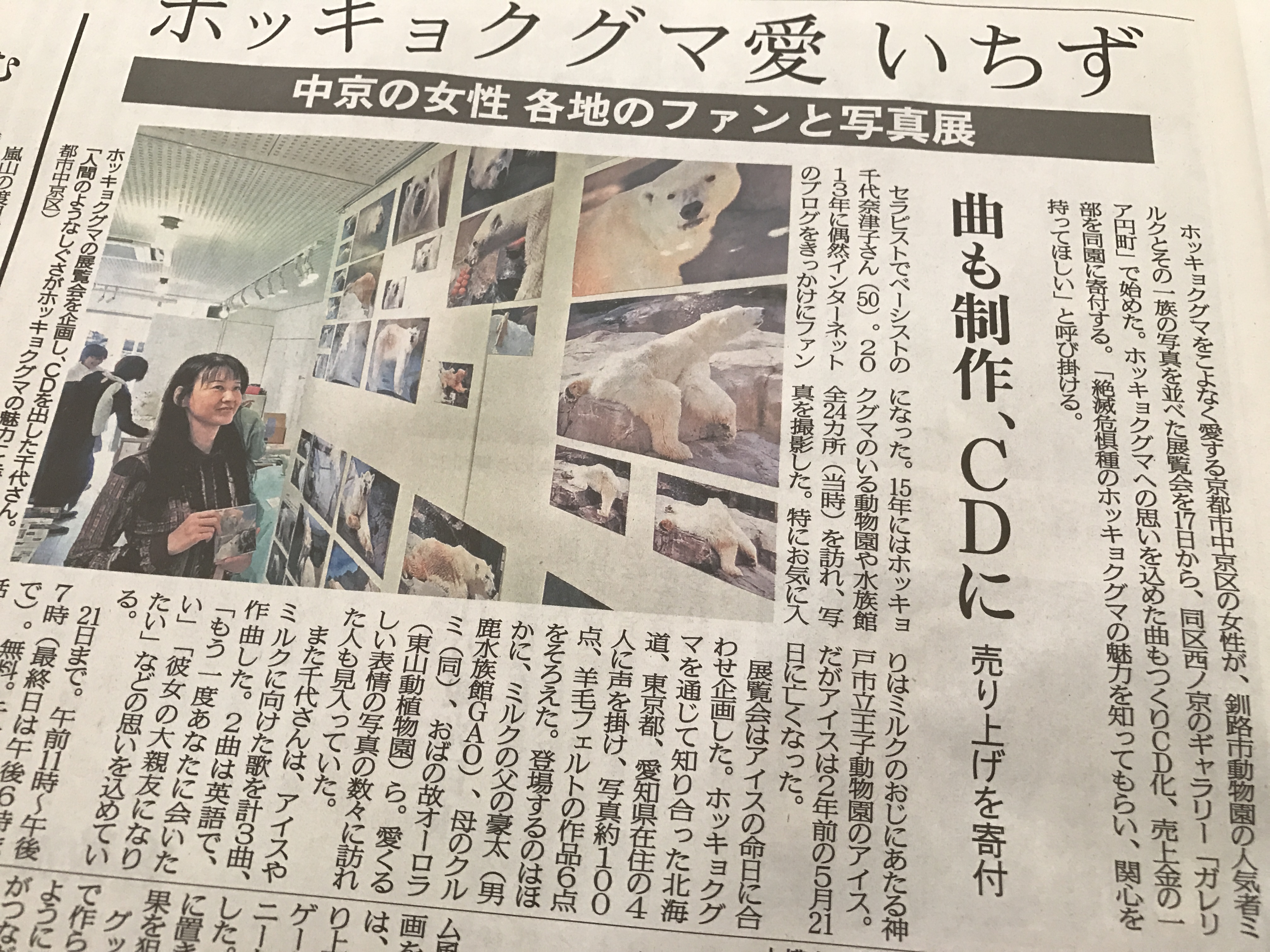 ☆5月17日〜21日に京都で開催されましたホッキョクグマの展覧会「ミルクちゃんファミリー展」の公式テーマソングCDの売上金の一部を釧路市動物園様に寄付いたしました。(6月2日)